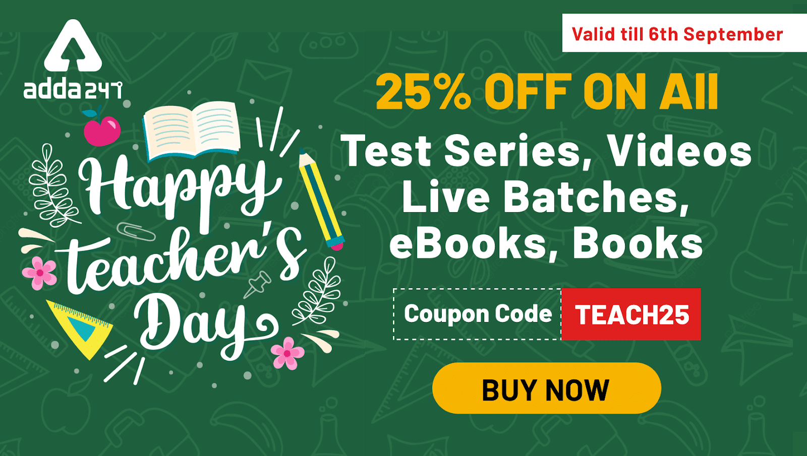 कई शिक्षण, बैंकिंग, रक्षा, एसएससी और रेलवे परीक्षा में उनके पूर्व, मुख्य या दोनों परीक्षाएं आगामी महीनों में आयोजित होने जा रही हैं. यदि आप इस वर्ष परीक्षा में बेहतर प्रदर्शन करना चाहते हैं तो टेस्ट सीरीज, विडियो कोर्स, टेस्ट सीरीज, वीडियो कोर्स, लाइव बैच, किताबें, प्राप्त करें और उनके साथ तब तक जुड़े रहें जब तक आप सफलता प्राप्त नहीं करते. वे आपकी तैयारी को सबसे बेहतर बनाने में सहायता करेंगे. शिक्षक दिवस की खुशियों की बौछार करने के लिए, और हमारे साथी छात्रों के साथ जश्न मनाने के लिए, Adda247 टीचिंग के प्रत्येक उत्पाद पर 25% की भारी छूट प्रदान कर रहा है. सभी बैंकरों, अधिकारियों और शिक्षकों को Adda247 की ओर से शिक्षक दिवस की हार्दिक शुभकामनाएं.