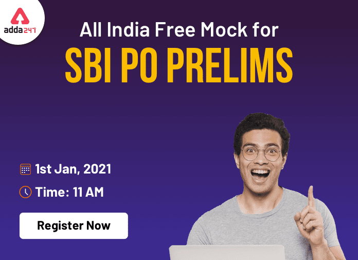 Adda247 आप सभी के लिए आगामी 1 जनवरी 2021 को SBI PO प्रीलिम्स परीक्षा के लिए एक Free All India Mock Test का आयोजन कर रहा है. SBI PO प्रीलिम्स परीक्षा 4 जनवरी से शुरू होकर 6 जनवरी 2021 तक आयोजित की जायेंगी. इसलिए हम सभी स्टूडेंट्स को सलाह देते हैं कि आप इस mock test को ज़रूर Attempt करने क्योंकि इससे आपको अपनी तैयारी का final overview पता चलेगा.
