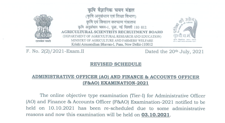 Important Notice: आपको बता दें कि ASRB ICAR Recruitment 2021 के सम्बन्ध में ASRB ने 20 जुलाई 2021को अपनी आधिकारिक वेबसाइट पर एक नोटिस जारी किया है, जिसमें कहा गया है कि कृषि वैज्ञानिक भर्ती बोर्ड (एएसआरबी) ICAR AO, F&AO भर्ती 2021 के लिए आयोजित की जाने वाली परीक्षा की तारीख में बदलाव करते हुए ऑनलाइन कंप्यूटर आधारित परीक्षा अब 3 अक्टूबर 2021 को आयोजित की जाएगी, जिसे पहले 10 अक्टूबर को तय किया गया था.