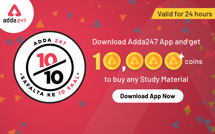 Adda247 को आखिरकार 10 साल पूरे हो गए हैं और हम सभी पाठकों के साथ इस खुशी को साझा करके बहुत खुश हैं, हमारी 10 Anniversary के शुभ अवसर पर, हम अपने सभी पाठकों को token के gift के रूप में 10000 coins प्रदान करना चाहते हैं. इन coins को 10% डिस्काउंट कूपन के रूप में redeemed किया जा सकता है. 10,000 coins वाले किसी भी छात्र को हमारे सभी प्रोडक्ट्स पर 10% की छूट मिल सकती है.