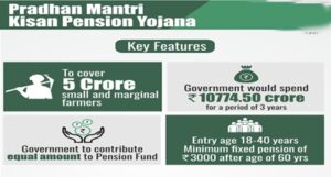 i. प्रधानमंत्री किसान पेंशन योजना के तहत 18-40 वर्ष की आयु के किसानों को प्रति माह 100 रुपये का योगदान करना होगा, जिससे उन्हें 60 वर्ष की आयु होने पर 3,000 रुपये की न्यूनतम निश्चित मासिक पेंशन दी जायेगी ।