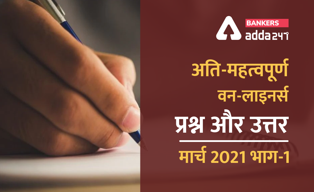 सभी Banking, Insurance और अन्य प्रतियोगी परीक्षाओं में के सबसे महत्वपूर्ण सेक्शन में से एक जनरल अवेयरनेस है, “General Awareness Section” मुख्य रूप से मेंस परीक्षा में add किया जाता है. इस सेक्शन में बिना अच्छी पकड़ के आप बैंकिंग परीक्षा नहीं क्रैक कर सकते हैं. तो क्या आप भी Current Affairs section के लिए best Study Material ढूंढ रहे हैं. Adda247 आप के लिए Current Affairs One Liners Questions and Answers of March 2021 (Part-1) लेकर आया है, यह One-Liners Questions and Answers of March 2021 (Part-1), किसी भी प्रतियोगी परीक्षा के General Awareness section को क्रैक करने में बहुत Helpful होगा, क्योंकि सामान्य जागरूकता किसी भी परीक्षा का एक महत्वपूर्ण सेक्शन होता है.