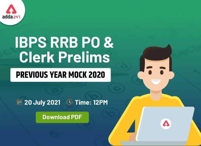 Adda247 ने 20 जुलाई 2021 को IBPS RRB PO और क्लर्क प्रीलिम्स पिछले वर्ष 2020 का मॉक (Previous Year Mock 2020) आयोजित किया हैं. इस मॉक टेस्ट में हजारों की संख्या में उम्मीदवार IBPS RRB PO & क क्लर्क प्रीलिम्स 2021 परीक्षा की अपनी तैयारी को टेस्ट करने के लिए शामिल हुए थे. हालाँकि कुछ स्टूडेंट्स कुछ कारणों के चलते इसमें शामिल नहीं हो पाए थे. इसलिए आज इस आर्टिकल में हम आपको IBPS RRB PO & क्लर्क प्रीलिम्स 2021 परीक्षा के लिए आयोजित पिछले वर्ष 2020 का मॉक (Previous Year Mock 2020) टेस्ट में पूछे गए सभी प्रश्नों के साथ-साथ उनके डिटेल सलूशन की Free PDF प्रदान कर रहे हैं. इस PDF के जरिए स्टूडेंट्स प्रैक्टिस भी कर सकते हैं और अपनी तैयारी का विश्लेषण कर सकते हैं.