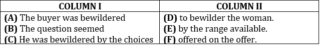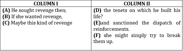 Directions (6-10): In the following questions two columns are given containing three sentences/phrases each. In first column, sentences/phrases are A, B and C and in the second column the sentences/phrases are D, E and F. A sentence/phrase from the first column may or may not connect with another sentence/phrase from the second column to make a grammatically and contextually correct sentence. Each question has five options, four of which display the sequence(s) in which the sentences/phrases can be joined to form a grammatically and contextually correct sentence. If none of the options given forms a correct sentence after combination, mark (e), i.e. “None of the above” as your answer.