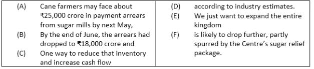 Directions (11-15): In the following questions two columns are given containing three sentences/phrases each. In first column, sentences/phrases are A, B and C and in the second column the sentences/phrases are D, E and F. A sentence/phrase from the first column may or may not connect with another sentence/phrase from the second column to make a grammatically and contextually correct sentence. Each question has five options, four of which display the sequence(s) in which the sentences/phrases can be joined to form a grammatically and contextually correct sentence. If none of the options given forms a correct sentence after combination or none of them connects, mark (e), i.e. “None of the above” as your answer.