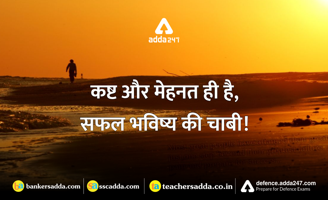 हर कोई एक बेहतर भविष्य बनाना चाहता है लेकिन उनमें से कुछ ही इसको प्राप्त करने के कठिन रास्ते पर चलने का साहस करते हैं. एक बार में उपलब्धि या गर्व की भावना प्राप्त करना आसान नहीं है. इसे प्राप्त करने में समय लगता है. अपने लक्ष्य को प्राप्त करने के लिए आज आप जिस संघर्ष से गुजरेंगे, वह आपको एक बेहतर भविष्य बनाने में मदद करेगा. सफल लोग वही होते हैं जिन्होंने सभी दुखों और कष्टों को झेला है. हम इंसान इतने आराम-प्रेमी हैं कि हम शायद ही कभी अपने कम्फर्ट ज़ोन से बाहर जाते हैं. वे व्यक्ति जो अपने कम्फर्ट ज़ोन से बाहर जाकर कठिन परिश्रम करते हैं, अंत में वे ही सफलता प्राप्त करते हैं.