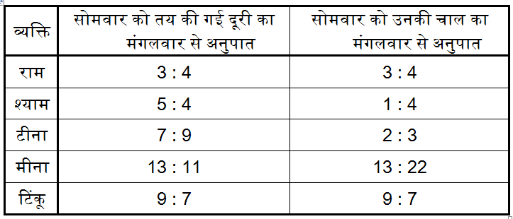 Directions (6-10): नीचे एक सारणी दी गई है, जो पांच व्यक्तियों द्वारा सोमवार को तय की गई दूरी का मंगलवार से अनुपात और सोमवार को इन व्यक्तियों की चाल का मंगलवार से अनुपात दर्शाती है। यहाँ एक लाइन ग्राफ भी है, जो मंगलवार की चाल के साथ मंगलवार को दी गई दूरी तय करने में इन व्यक्तियों द्वारा लिया गया समय दर्शाता है।