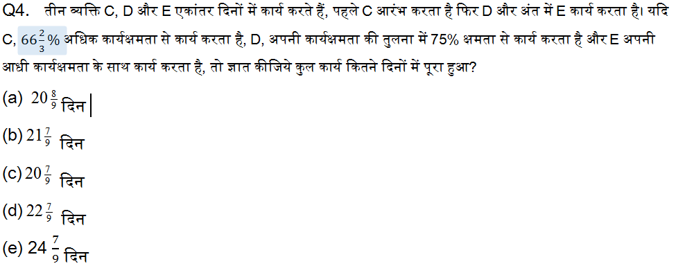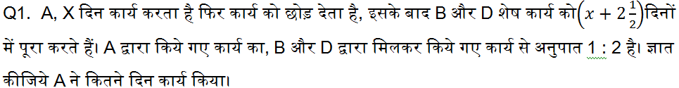 Q3. D कार्य आरंभ करता है और X दिन कार्य करने के बाद इसे छोड़ देता है एवं फिर C कार्य में शामिल होता है और Y दिन कार्य करता है। C के छोड़ने के बाद, E शेष कार्य को 3 दिनों में पूरा करता है। D और C अलग अलग कितने दिनों कार्य करते हैं, दिया गया है कि Y का मान, X के मान का 200% है।