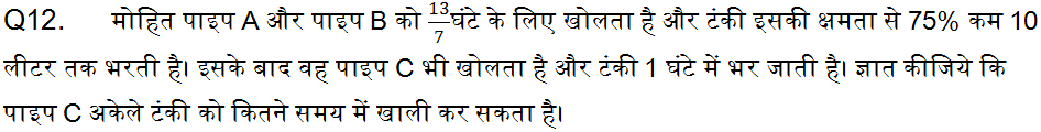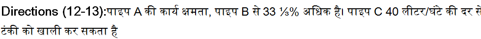 Q13. जब ये पाइप एक अन्य टंकी से जोड़े गये थे। प्रारंभ में, पाइप A और B खोले गए थे, जब तक टंकी की 75% क्षमता से 10 लीटर अधिक पानी भरा न जाए। इसके बाद सभी पाइप खोले गए थे, और शेष टंकी को 1 घंटे में भरी गयी थी। टंकी की क्षमता ज्ञात कीजिये। दिया गया है कि पाइप A टंकी भरने में 4 घंटे का समय लेगी।