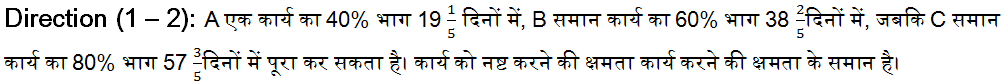 Direction (5-6): A, B से दोगुना कार्यकुशल है एक कार्य को पूरा करने के लिए B, C 8 अधिक दिन लेता है। A समान कार्य को 6 दिनों में पूरा करने के लिए अनुबंध लेता है। 2 दिन बाद, उसे महसूस होता है कि वह अकेले दी गयी समय अवधि में 60% कार्य पूरा कर सकता है। इसलिए, वह मदद मांगता है, B और C अंतिम 3 दिनों के लिए शामिल होते हैं और कार्य समय पर पूरा होता है।