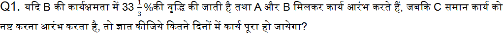 Q6. यदि वे सभी मिलकर कार्य शुरू करते हैं और A और C दोनों दो दिन बाद कार्य छोड़ देते हैं तो शेष कार्य B अकेले पूरा करता है। B द्वारा किये गये कुल कार्य का कितना % है?
