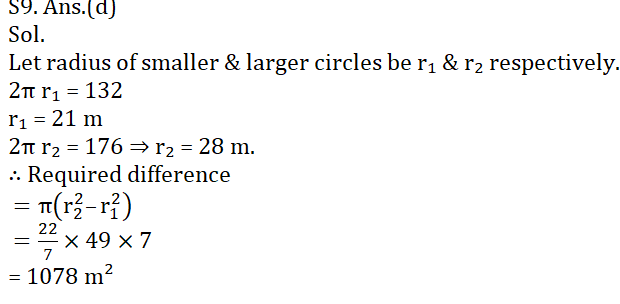 Q9. दो वृत्तों की परिधि क्रमशः 132 मी. और 176 मी. है। बड़े वृत्त और छोटे वृत्त के क्षेत्रफल (मी.²) के बीच अंतर कितना है?