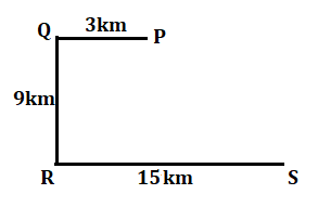 एक व्यक्ति बिंदु P से आरम्भ करता है और बिंदु Q पर पहुँचने के लिए 3 किमी पश्चिम की ओर यात्रा करता है फिर वह बाएं मुड़ता है और बिंदु R पर पहुँचने के लिए 9 किमी की यात्रा करता है। वह फिर दोबारा बाएं मुड़कर 15 किमी की यात्रा करता है और बिंदु S पर पहुँचता है।