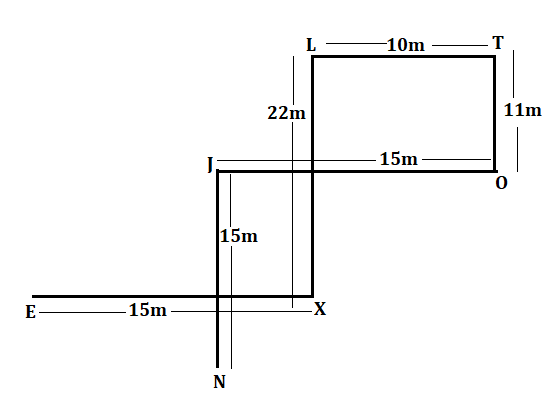 एक व्यक्ति बिंदु E से पूर्व दिशा में चलना आरम्भ करता है और बिंदु X पर पहुँचने के लिए 15 मीटर चलता है। फिर वह बिंदु L पर पहुँचने के लिए उत्तर दिशा में 22 मीटर चलता है। अब, वह दाएं मुड़ता है और बिंदु T पर पहुँचने के लिए 10 मीटर चलता है और उसके बाद वह दाएं मुड़ता है और बिंदु O पर पहुँचने के लिए 11 मीटर चलता है। बिंदु O से वह पश्चिम दिशा में चलना शुरू करता है और बिंदु J पर पहुँचने के लिए 15 मीटर की दूरी तय करता है। बिंदु J से, वह बाएं मुड़ता है और बिंदु N पर पहुँचने के लिए 15 मीटर चलता है।