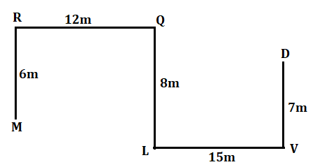 अनु बिंदु D से अपनी यात्रा शुरू करती है, बिंदु V पर पहुँचने के लिए दक्षिण की ओर 7 मीटर चलती है, फिर वह दाएं मुड़ती है और बिंदु L पर पहुँचने के लिए 15 मीटर चलती है। बिंदु L से वह दाएं मुड़ती है और बिंदु Q पर पहुँचने के लिए 8 मीटर चलती है, बिंदु Q से वह बाएं मुड़ती है और बिंदु R पर पहुँचने के लिए 12 मीटर चलती है, फिर वह दोबारा बाएं मुड़ती है और बिंदु M पर पहुँचने के लिए 6 मीटर चलती है।