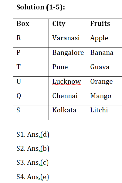 छ: डब्बे एक के ऊपर एक के क्रम में रखे जाते हैं. सभी डब्बों को अलग-अलग शहरों में पार्सल किया जाता है. प्रत्येक डब्बे में विभिन्न फल हैं. डब्बा Q चेन्नई पार्सल किया जात है. वह डब्बा जिसे बैंगलोर पार्सल किया जा रहा है उसमें आम नहीं हैं. वह डब्बा जिसे वाराणसी पार्सल किया जा रहा है वह बंगलोर पार्सल किये जाने वाले डब्बे के ठीक ऊपर है. डब्बा T पुणे पार्सल किया जाता है और उसमे अमरुद रखे गए हैं. डब्बे T और लीची के डब्बे के मध्य दो डब्बे रखे गए हैं. वह डब्बा जिसे चेन्नई पार्सल किया जा रहा है उसमें सेब नहीं है. डब्बा T न ही सबसे ऊपर न ही सबसे नीचे रखा गया है. डब्बा P, डब्बे U के ऊपर रखा गया है. डब्बा जिसे चेन्नई पार्सल किया जा रहा है वह उस डब्बे के ठीक ऊपर रखा गया है जिसमें लीची है.