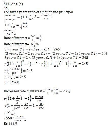 Q11. एक मूलधन और तीन वर्ष के चक्रवृद्धि ब्याज का अनुपात 216: 127 है। तीसरे वर्ष के चक्रवृद्धि ब्याज और दूसरे वर्ष के चक्रवृद्धि ब्याज के बीच का अंतर 245 रु. है। यदि ब्याज की दर 38% बढ़ जाए, तो दो वर्ष में समान राशि पर चक्रवृद्धि ब्याज और साधारण ब्याज के मध्य का अंतर कितना है?