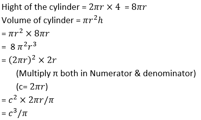 Q1. यदि एक बेलन की ऊँचाई उसके आधार की परिधि का 4 गुना है, तो उसके आधार की परिधि के संदर्भ में बेलन की मात्रा, c है -