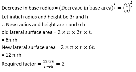 Q14. एक सम बेलन की ऊंचाई में छह गुना वृद्धि होती है और इसके आधार का क्षेत्रफल इसके मान के 1/9 तक कम हो जाता है। कारक जिसके द्वारा बेलन के पार्श्व पृष्ठीय क्षेत्रफल में वृद्धि होती है।