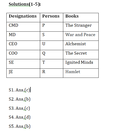 तीन से अधिक व्यक्ति T से वरिष्ठ हैं. S, इग्नाइटेड माइंडस को पसंद करने वाले से वरिष्ठ है. Q उस व्यक्ति से जूनियर है जिसे अलकेमिस्ट पसंद है. U, P से जूनियर है लेकिन R से सीनियर है. वह व्यक्ति जो MD है उसे अलकेमिस्ट पसंद नहीं है. R, COO नहीं है. वह व्यक्ति जो CMD है उसे दी स्ट्रेंजरस पसंद है. वह व्यक्ति जिसे दी सीक्रेट पसंद है वह T से वरिष्ठ है. U न तो COO है और न ही MD है. S को न तो दी सीक्रेट न ही दी स्ट्रेंजरस पसंद है. R को न तो वॉर और पीस न ही इग्नाइटेड माइंडस पसंद है. एक व्यक्ति को हैमलेट पसंद है. वह व्यक्ति जिसे दी सीक्रेट पसंद है वह इग्नाइटेड माइंडस पसंद करने वाले से जूनियर नहीं हैं.