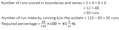 Q13. एक बल्लेबाज 110 रन बनाता है जिसमें 3 चौके और 8 छक्के शामिल है. अपने कुल स्कोर का कितने प्रतिशत रन, उसने दोड़कर पुरे किया?