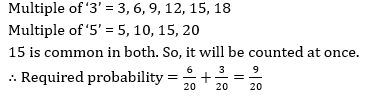 Q8. टिकेट संख्या 1 से 20 को मिला दिया जाता है और एक टिकेट को याद्रछिक रूप से निकाला जाता है. प्रायिकता ज्ञात कीजिये कि निकाले गये टिकेट की संख्या 3 या 5 की गुणज है?