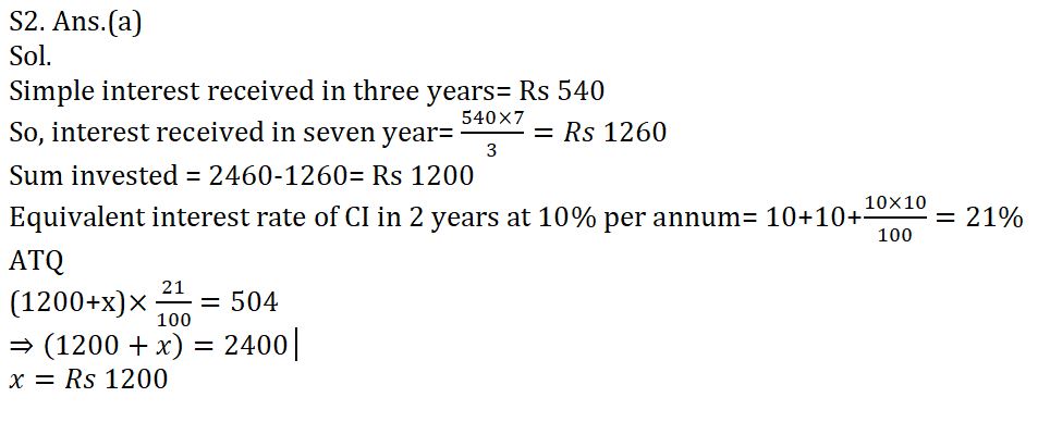 Q2. एक राशि साधारण ब्याज पर, वर्षों में 2460 रु. और  10 वर्षों में 3000 रु. हो जाती है, इस राशि को  ‘x’ बढाया जाता है और  चक्रवृद्धि ब्याज की 10% ब्याज दर पर निवेश किया जाता है, और दो वर्षों के बाद  504 रु. ब्याज प्राप्त होता है, ‘x’ का मान ज्ञात कीजिये ?