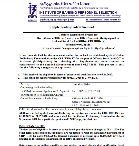 इंस्टीट्यूट ऑफ बैंकिंग पर्सनेल सिलेक्शन (IBPS) प्रीलिम्स की परीक्षा फिर से आयोजित किए जाने के सम्बन्ध में जारी किये गये इस आधिकारिक नोटिस के अनुसार, ऑफिसर स्केल I के लिए पुन: परीक्षा ( re-exam) 31 दिसंबर, 2020 को आयोजित की जाएगी। कार्यालय सहायक (बहुउद्देशीय) या Office Assistant (Multipurpose) के लिए पुन: परीक्षा 2 जनवरी, 2021 या 4 जनवरी, 2021 को आयोजित की जाएगी। ऑनलाइन आईबीपीएस आरआरबी की रजिस्ट्रेशन विंडो 26 अक्टूबर को फिर से खुलेगी। उम्मीदवार 9 नवंबर, 2020 तक परीक्षा के लिए आवेदन कर सकते हैं। (IBPS RRB will re-open on October 26. Candidates can apply for the exam till November 9, 2020.)
