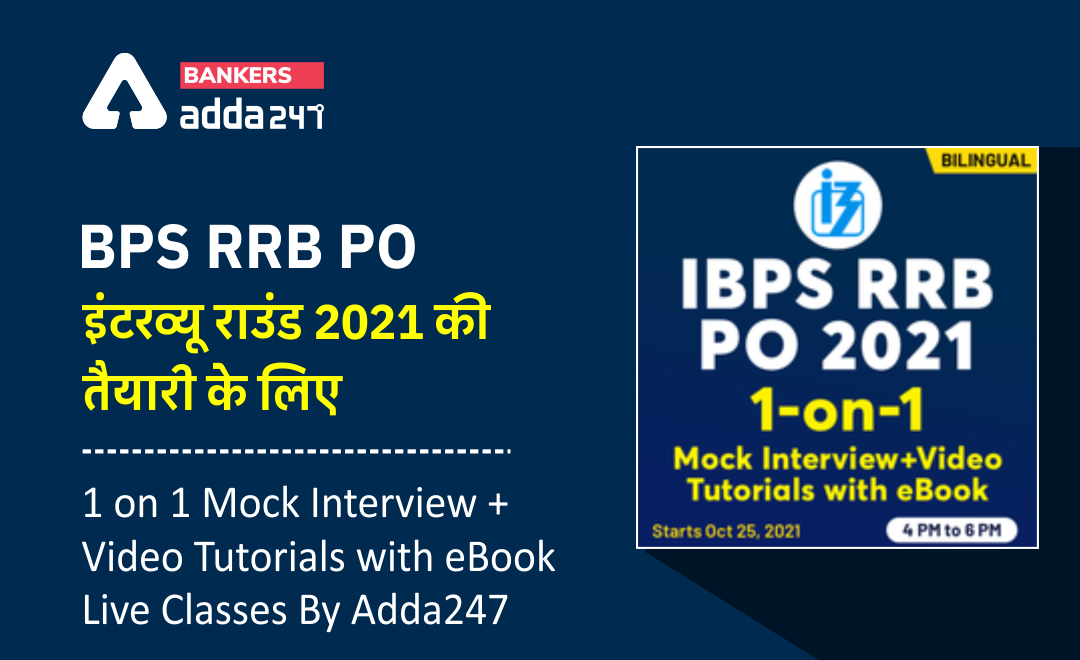 बैंकिंग कार्मिक चयन संस्थान (IBPS) ने 25 सितंबर 2021 को सफलतापूर्वक आईबीपीएस आरआरबी पीओ मेन्स परीक्षा 2021 ( IBPS RRB PO Mains exam 2021 ) आयोजित की है। जो उम्मीदवार आईबीपीएस आरआरबी पीओ मेन्स परीक्षा को क्वालीफाई करेंगे, उन्हें Interview round के लिए बुलाया जाएगा। साक्षात्कार वाला राउंड अक्टूबर / नवंबर 2021 के महीने में आयोजित होने की उम्मीद है। इसलिए, सभी उम्मीदवारों को Interview round की तैयारी शुरू करने की सलाह दी जाती है, क्योंकि यह आईबीपीएस आरआरबी पीओ 2021 चयन प्रक्रिया ( IBPS RRB PO 2021 Selection procedure) का अंतिम चरण है। आईबीपीएस आरआरबी पीओ इंटरव्यू राउंड 2021(IBPS RRB PO interview round 2021) की तैयारी में आपकी मदद करने के लिए Adda247 यहां लाइव क्लासेस लेकर आया है, जिसमें ईबुक के साथ 1 पर 1 मॉक इंटरव्यू + वीडियो ट्यूटोरियल (1 on 1 Mock Interview + Video Tutorials with eBook.) शामिल होंगे।