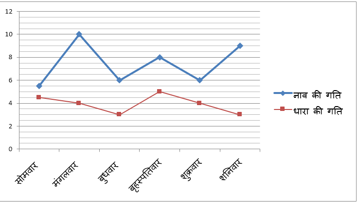 Directions (1-5): निम्नलिखित लाइन चार्ट एक व्यक्ति के गोमती नदी के पार विभिन्न स्थानों पर जाने के लिए रविवार के अतिरिक्त सप्ताह के दिनों की धारा और नाव की गति को दर्शाता है। तालिका उसके द्वारा साप्ताहिक दिन पर जाने वाले स्थानों को दर्शाती है (मान लीजिये वापसी यात्रा पर नदी पार करने की गति धारा के अनुकूल है)