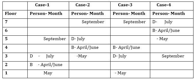 (ii)- A is younger than N and lives an odd number floor above B. By using this condition case-4 will be eliminated. M is the oldest person and lives immediate above O. That means M was born in March. N lives immediate above C. By using this condition case-1 and Case-2 will be eliminated. C is younger than B but older than O. O was born in the month which have even numbers of days and younger than B. The final arrangement is-
