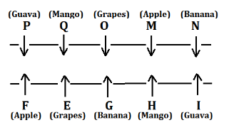 दस व्यक्ति दो समानांतर पंक्तियों में बैठे हैं. M, N, O, P और Q पहली पंक्ति में दक्षिण की ओर उन्मुख होकर बैठे हैं. E, F, G, H और I दूसरी पंक्ति में उत्तर की ओर उन्मुख होकर बैठे हैं. उन्हें विभिन्न फल पसंद है- आम, अमरूद, सेब, केला और अंगूर. दो व्यक्तियों को एक ही फल पसंद है और दोनों में से एक व्यक्ति पहली पंक्ति और एक दूसरी पंक्ति में बैठा है (अर्थात दोनों व्यक्ति जिन्हें आम पसंद है वे अलग अलग पंक्तियों में बैठे हैं).