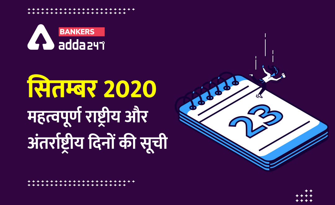 Important days In September – Adda247 हर महीने महत्वपूर्ण राष्ट्रीय और अंतर्राष्ट्रीय दिनों की लिस्ट उपलब्ध कारता है. जिससे सम्बंधित प्रश्न Bank Exam के General Awareness Section में पूछे जाते हैं. सभी बैंकिंग परीक्षाओं में सामान्य जागरूकता का एक सेक्शन होता है, जो अधिकांश बैंकिंग भर्ती के मेंस चरण में होता है. उसमें 2-3 प्रश्न Important days सम्बंधित होते हैं. ऐसे में हम हर महीने के महत्वपूर्ण दिनों की लिस्ट समय-समय पर उपलब्ध कराते हैं. परीक्षा के नज़रिए से ये दिन महत्वपूर्ण हैं क्योंकि उन्हें अक्सर SSC, Banking और Railway जैसी सरकारी भर्ती परीक्षाओं में पूछा जाता है।