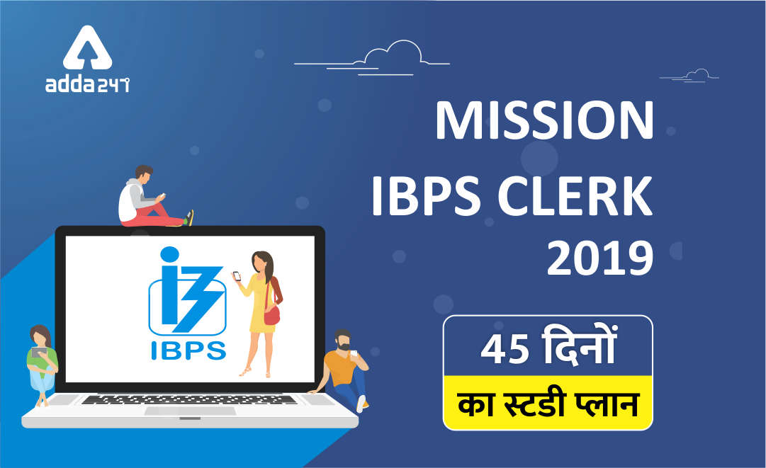 ADDA247 ने “Mission IBPS Clerk 2019 – 45 Days Study Plan” लॉन्च किया है। यह दैनिक स्टडी प्लान है। इस स्टडी प्लान में आईबीपीएस क्लर्क 2019 की प्रारंभिक परीक्षा के सभी तीनों विषयों शामिल होंगें।