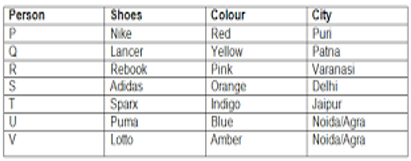 सात मित्र P, Q, R, S, T, U, V विभिन्न शहरों आगरा, नोएडा, पटना, दिल्ली, वाराणसी, जयपुर और पुरी से सम्बंधित हैं. वे सभी विभिन्न ब्रांड के जूते जैसे नाइक, लोटो, लांसर, स्पार्क्स, प्यूमा, एडिडास और रिबॉक पहनते हैं. वे सभी विभिन्न रंग जैसे नारंगी, लाल, पीला, नीला, एम्बर, इंडिगो और गुलाबी पसंद करते हैं. T स्पार्क्स के जूते पहनता है और इंडिगो रंग पसंद करता है. लैंसर के जूते पहनने वाले व्यक्ति को नीला और गुलाबी रंग पसंद नहीं है. U रीबॉक और लोटो के जूते नहीं पहनता और नीला रंग पसंद करता है. P को गुलाबी या पीला रंग पसंद नहीं. S दिल्ली से सम्बंधित है और एडिडास के जूते पहनता है. Q पटना से सम्बंधित है और नाइक के जूते नहीं पहनता. V या तो पुमा या लोटो के जूते पहनता है. Q लोटो के जूते नहीं पहनता. पीला रंग पसंद करने वाला व्यक्ति नोएडा या दिल्ली से सम्बंधित नहीं है. जयपुर से सम्बंधित व्यक्ति को इंडिगो रंग पसंद है. वाराणसी से सम्बंधित व्यक्ति को गुलाबी रंग पसंद है और वह रीबॉक के जूते पहनता है. नाइक के जूते पहनने वाला व्यक्ति या तो पुरी से या जयपुर से सम्बंधित है. S को नारंगी रंग पसंद है. लोटो के जूते पहनने वाला व्यक्ति एम्बर रंग पसंद करता है. U पुरी से सम्बंधित नहीं है..