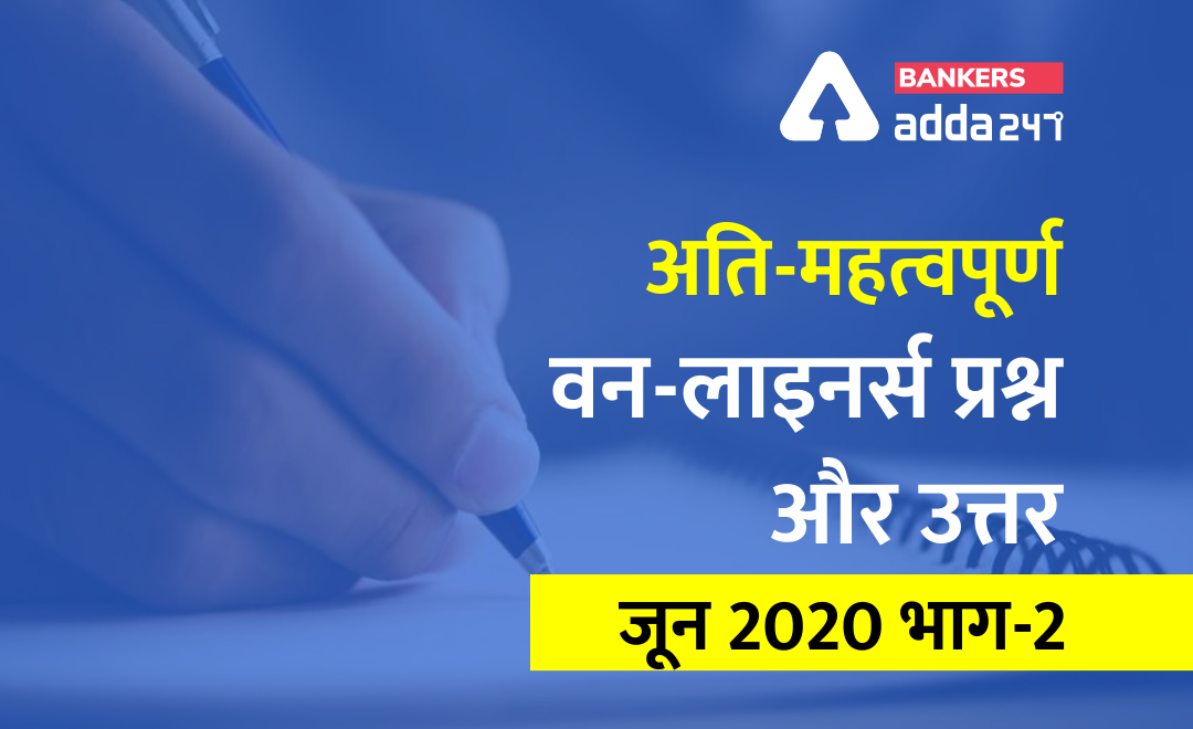 सभी Banking, Insurance और अन्य प्रतियोगी परीक्षाओं में के सबसे महत्वपूर्ण सेक्शन में से एक जनरल अवेयरनेस है, यह सेक्शन मुख्य रूप से मेंस परीक्षा में add किया जाता  है. इस सेक्शन में बिना अच्छी पकड़ के आप बैंकिंग परीक्षा नहीं क्रैक कर सकते हैं. तो क्या आप भी Current Affairs section के लिए best Study Material ढूंढ रहे हैं. Adda247 आप के लिए One-Liners (Questions and Answers) of JUNE 2020 (Part-2) लेकर आया है, यह One-Liners Questions and Answers of June 2020, किसी भी प्रतियोगी परीक्षा के General Awareness section को  क्रैक करने में बहुत Helpful होगा, क्योंकि सामान्य जागरूकता किसी भी परीक्षा का एक महत्वपूर्ण सेक्शन होता है.
