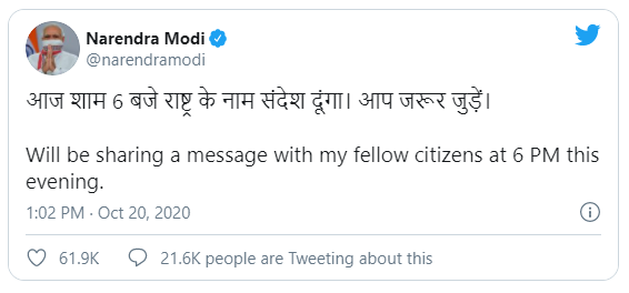 प्रधानमंत्री नरेंद्र मोदी ने आज ट्वीट कर जानकारी देते हुए कहा था – , ‘आज शाम 6 बजे राष्ट्र के नाम संदेश दूंगा, आप जरूर जुड़ें’.