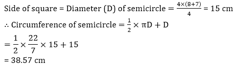 Q12. एक वर्ग का परिमाप, 8 सेमी लम्बाई और 7 सेमी चौड़ाई के आयत के परिमाप के दोगुने के बराबर है। अर्द्धवृत्त का परिधि कितनी होगा जिसका व्यास वर्ग की भुजा के बराबर है? (दो दशमलव स्थानों तक) (π = 3.14 लीजिए)