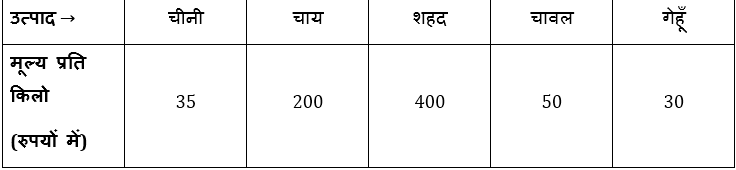 Q4. चीनी और शहद को मिलाकर कुल मूल्य का औसत तथा चावल और गेहूं को मिलाकर कुल मूल्य के औसत के मध्य कितना अंतर (रुपये में) है?