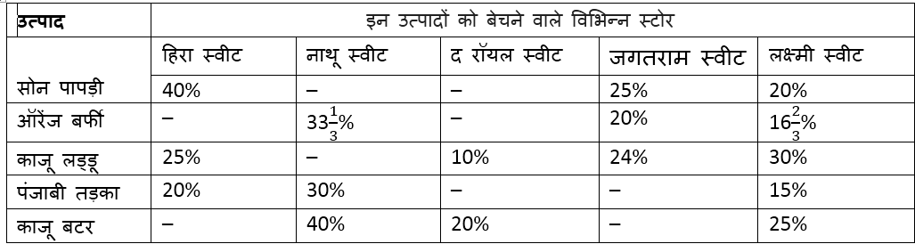 Q2. यदि सभी पांच स्टोरों द्वारा काजू लडु पर प्राप्त लाभ प्रतिशत का औसत 23% है। नाथू मिठाई द्वारा काजू लड्डू पर प्राप्त प्रतिशत लाभ ज्ञात कीजिये।