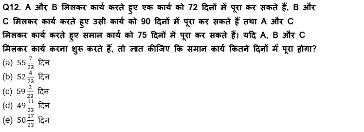 Q15. पंकज और सुरेश ने एक साझेदारी व्यवसाय में 4 : 3 के अनुपात में पूँजी का निवेश किया। पंकज और सुरेश क्रमशः 5 महीने और 10 महीने बाद व्यवसाय छोड़ देते हैं। सुरेश के चले जाने पर राजू 50000 रुपये के साथ व्यवसाय में शामिल हो गया, और उन्होंने 1 वर्ष के बाद व्यवसाय समाप्त कर दिया। यदि एक वर्ष के अंत में पंकज, सुरेश और राजू का लाभ विभाजन अनुपात 2:3:1 है, तो पंकज और सुरेश द्वारा निवेश की गई पूंजी के बीच का अंतर ज्ञात कीजिए?