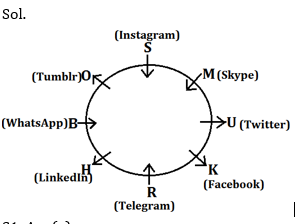 आठ मित्र एक वृत्ताकार मेज़ के चारो ओर इस प्रकार बैठे हैं कि उनमें से कुछ बाहर की ओर उन्मुख हैं जबकि कुछ केंद्र की ओर उन्मुख हैं। उनमें से प्रत्येक के अलग-अलग सोशल नेटवर्किंग प्लेटफार्म पसंद है। टम्बलर पसंद करने वाला व्यक्ति बाहर की ओर उन्मुख है और R के बाएं से तीसरे स्थान पर बैठा है। H, O के बाएं से दूसरे स्थान पर बैठा है, जो बाहर की ओर उन्मुख है। H, M के विपरीत बैठा है, जो स्काइप को पसंद करता है। O और R एक दूसरे के निकट नहीं बैठे हैं। H को टम्बलर पसंद नहीं है। R, टेलीग्राम पसंद करता है और S के विपरीत बैठा है और दोनों एक दूसरे की ओर उन्मुख हैं। B ट्विटर को पसंद करने वाले व्यकित के विपरीत बैठा है, और दोनों समान दिशा की ओर उन्मुख नहीं हैं। B, M के निकट नहीं बैठा है। B, S के समान दिशा की ओर उनमुख है। फेसबुक पसंद करने वाला व्यक्ति R के ठीक दाएं स्थान पर बैठा है। S को लिंक्डइन और व्हाट्सएप पसंद नहीं है। व्हाट्सएप पसंद करने वाला व्यक्ति टम्बलर पसंद करने वाले व्यक्ति के ठीक बाएं स्थान पर बैठा है। U व्हाट्सएप पसंद करने वाले व्यक्ति के विपरीत बैठा है। R के निकटतम पड़ोसी, R के विपरीत दिशा की ओर उन्मुख है। K को इन्स्टाग्राम पसंद नहीं है और M के विपरीत दिशा की ओर उन्मुख है।
