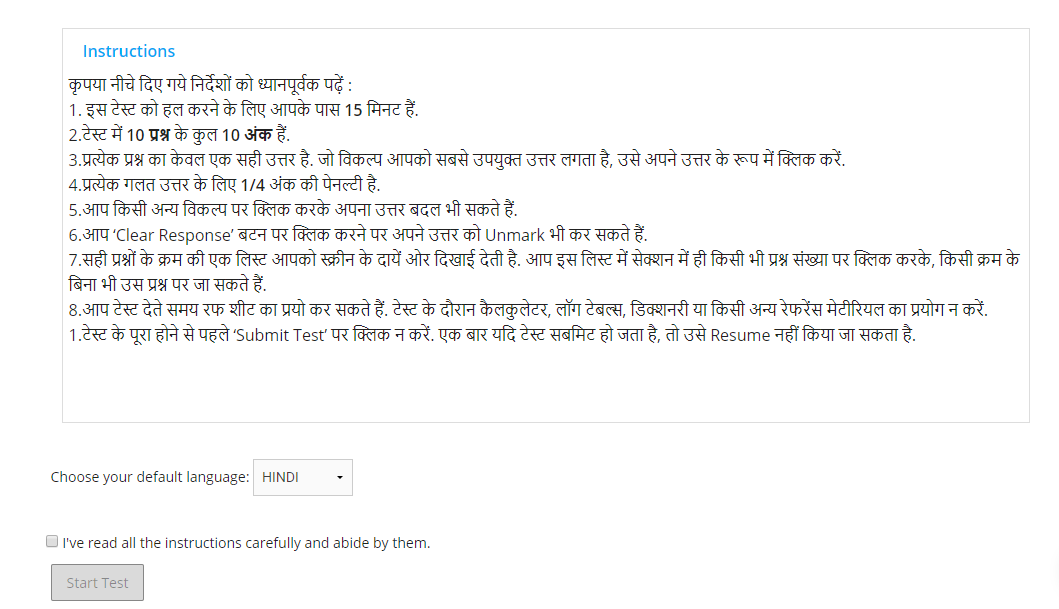 Step 4: भाषा का चयन करें इसमें आप हिंदी और English Language दोनों में से किसी एक का चयन करके Start Test पर क्लिक करें और क्विज़ शुरू हो जायेगी.