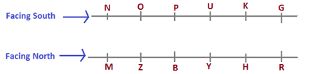 बारह व्यक्ति दो समानांतर पंक्तियों में बैठे हैं जिनमें से छह व्यक्ति इस तरह से बैठे हैं कि आसन्न व्यक्तियों के बीच समान दूरी है। पंक्ति 1 में, G, O, U, N, K और P बैठे हैं और सभी दक्षिण की ओर उन्मुख हैं। पंक्ति 2 में, Z, Y, H, B, M और R बैठे हैं और सभी उत्तर की ओर उन्मुख हैं। हालांकि, दी गयी बैठने की व्यवस्था में, एक पंक्ति में बैठा प्रत्येक सदस्य, दूसरी पंक्ति में बैठे अन्य सदस्य की ओर उन्मुख है। R,B के दायें से तीसरे स्थान पर बैठा है। B, P की ओर उन्मुख है और P, पंक्ति के किसी भी अंतिम सिरे पर नहीं बैठा है। N, U के दायें से तीसरे स्थान पर बैठा है।H, K की ओर उन्मुख है। K की ओर उन्मुख व्यक्ति, Z के दायें से तीसरे स्थान पर बैठा है। O और Z, पंक्ति के किसी अंतिम सिरे पर नहीं बैठे हैं। M, B निकटतम पड़ोसी नहीं है और P, N निकटतम पड़ोसी नहीं है।