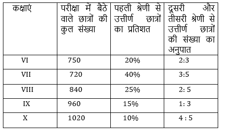 Directions (7-12): निम्न दी गयी तालिका, पांच भिन्न कक्षाओं की परीक्षा में बैठने वाले छात्रों की कुल संख्या, प्रथम श्रेणी से उत्तीर्ण छात्रों की संख्या का प्रतिशत तथा दूसरी और तीसरी श्रेणी से उत्तीर्ण छात्रों की संख्या का अनुपात दर्शाती है।