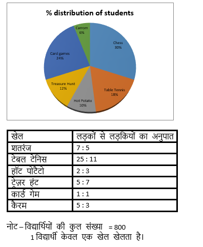 Q2. शतरंज, टेबल टेनिस और कार्ड गेम को मिलाकर खेलने वाली लड़कियों की औसत संख्या का, हॉट पोटैटो और कार्ड गेम को मिलाकर खेलने वाले लड़कों की संख्या से अनुपात ज्ञात कीजिये।