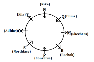 Q उस व्यक्ति के दायें से तीसरे स्थान पर बैठता है, जिसे कॉनवर्स पसंद है। जो व्यक्ति एडिडास को पसंद करता है, वह Q के दाईं से तीसरे स्थान पर बैठता है। S, नॉर्थफेस ब्रांड को पसंद करता है और एडिडास को पसंद करने वाले व्यक्ति के ठीक बाईं ओर बैठता है। R का मुख बाहर की ओर है और वह न तो एडिडास पसंद करने वाले व्यक्ति और न ही Q का निकटतम पडोसी है .