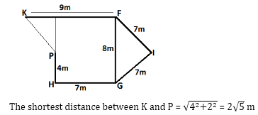 छह व्यक्ति F, G, H, I, K और P इस प्रकार खड़े हैं कि G, H से 7 मी दूर पूर्व में है. F, I से 7 मी दूर उत्तर-पश्चिम में है. K, F से 9 मी दूर पश्चिम में है. I, G से 7 मी दूर उत्तर-पूर्व में है. F, G से 8 मी दूर उत्तर में है. P, H के उत्तर में 4 मी दूर है.