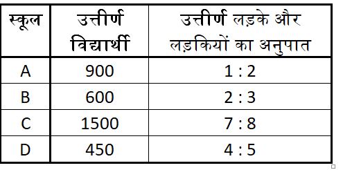 Q4. यदि स्कूल D में, अनुत्तीर्ण लड़कों से अनुत्तीर्ण लड़कियों की संख्या का अंतर 25 हो, तो स्कूल D से अनुत्तीर्ण विद्यार्थियों का उत्तीर्ण विद्यार्थियों से अनुपात कितना है?