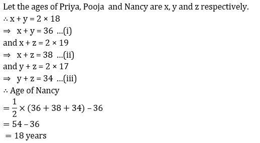 Q6.प्रिया और पूजा की औसत आयु 18 वर्ष है। जब नैंसी पूजा की जगह लेती है, तो औसत आयु में 1 की वृद्धि होती है और जब पूजा प्रिया की जगह लेती है तो औसत आयु 17 वर्ष हो जाती है। नैंसी की आयु कितनी है?